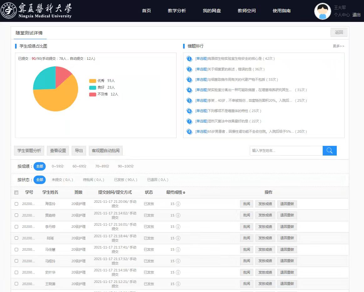 基础医学院本学期承担本专科生课程累计62门,截止11月20日,线上教学任务学时达两千二百多,其中,线上实践教学学时占20%左右。全体师生再次搭起空中课堂,积极行动、快速动员、克服困难,学院全体领导班子、各学系主任闻令而动,共谋划,同响应,使得线上教学秩序有条不紊,教学质量稳中有升:一、凝心聚力,统筹行动:学院及各学系主任及时召开线上教学例会,部署线上教学工作;二、充分发挥基层教学组织示范引领作用,会同教发中心开展全校线上教学培训,得到全校教师认可;三、各学系通过线上集体备课与试讲的形式,共同探讨线上教学授课技巧,为即将授课的各位教师提供线上教学思路与方法;四、授课教师积极将抗疫课程思政内容融入课堂教学,增加学生的自信心,激发学生的学习动力,增强学生的责任感和使命感;五、根据线上教学的特殊性,教师充分准备在线教学资源,不断加强线上互动教学;六、利用国家级虚拟仿真实验建设项目优势,充实虚拟仿真实验课程,助力实践教学........通过对线上教学的周密安排,学院的每一位授课老师都做了充分的准备,保证了疫情期间线上教学不降“调”,且内容丰富,形式多样,同时注重学生学习的体验感,视频教学中灿烂的笑容拉近了与学生的距离,充分发挥较强的课堂组织能力,提升线上教学的趣味性,深受学生喜爱。此外,校领导和教学督导组成员通过“线上抽巡”方式及时关注教学动态,深入线上课堂,对我院部分课程进行听课评课和跟踪督导,给予了充分肯定,同时提出反馈意见,确保有序、有效、高质量线上教学。