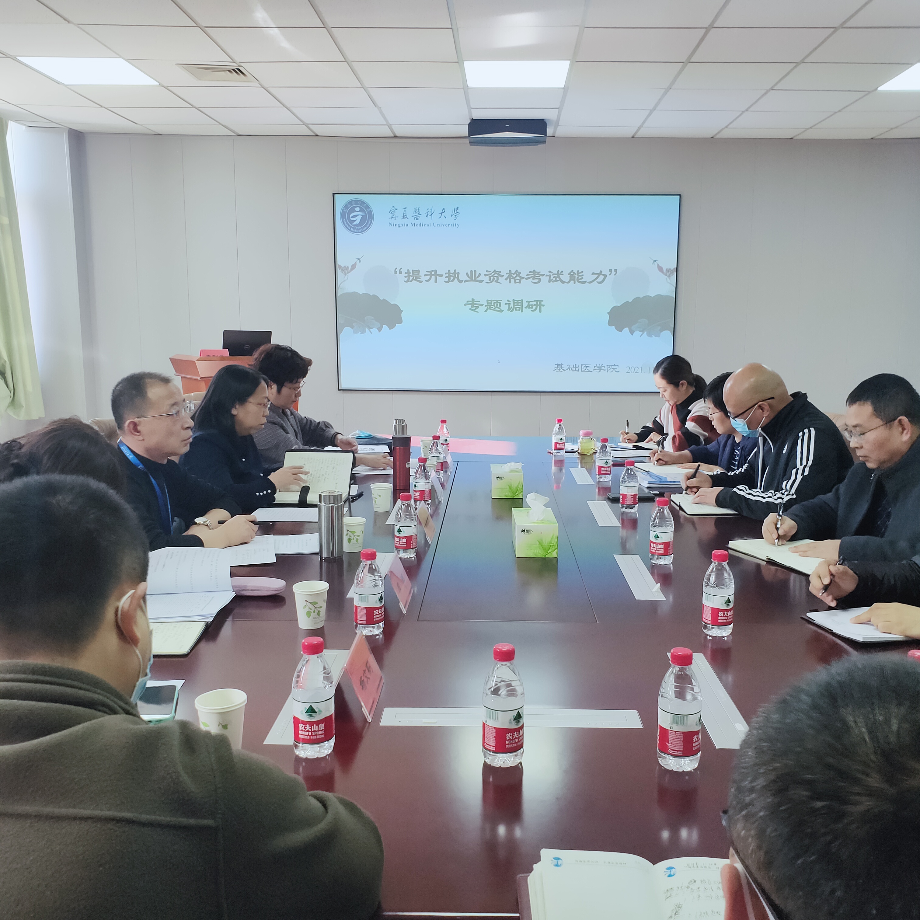 为深化医教协同改革,提升本专科教育教学质量。11月24日、25日下午,“提升执业资格考试能力”专题调研活动在基础医学院厚生楼313会议室召开。学校教务处、临床实践教学中心、教师教学发展中心、教学质量监控与评估中心负责人以及基础医学院领导班子、各学系主任等相关人员参会。会议由学校杜勇副校长主持。