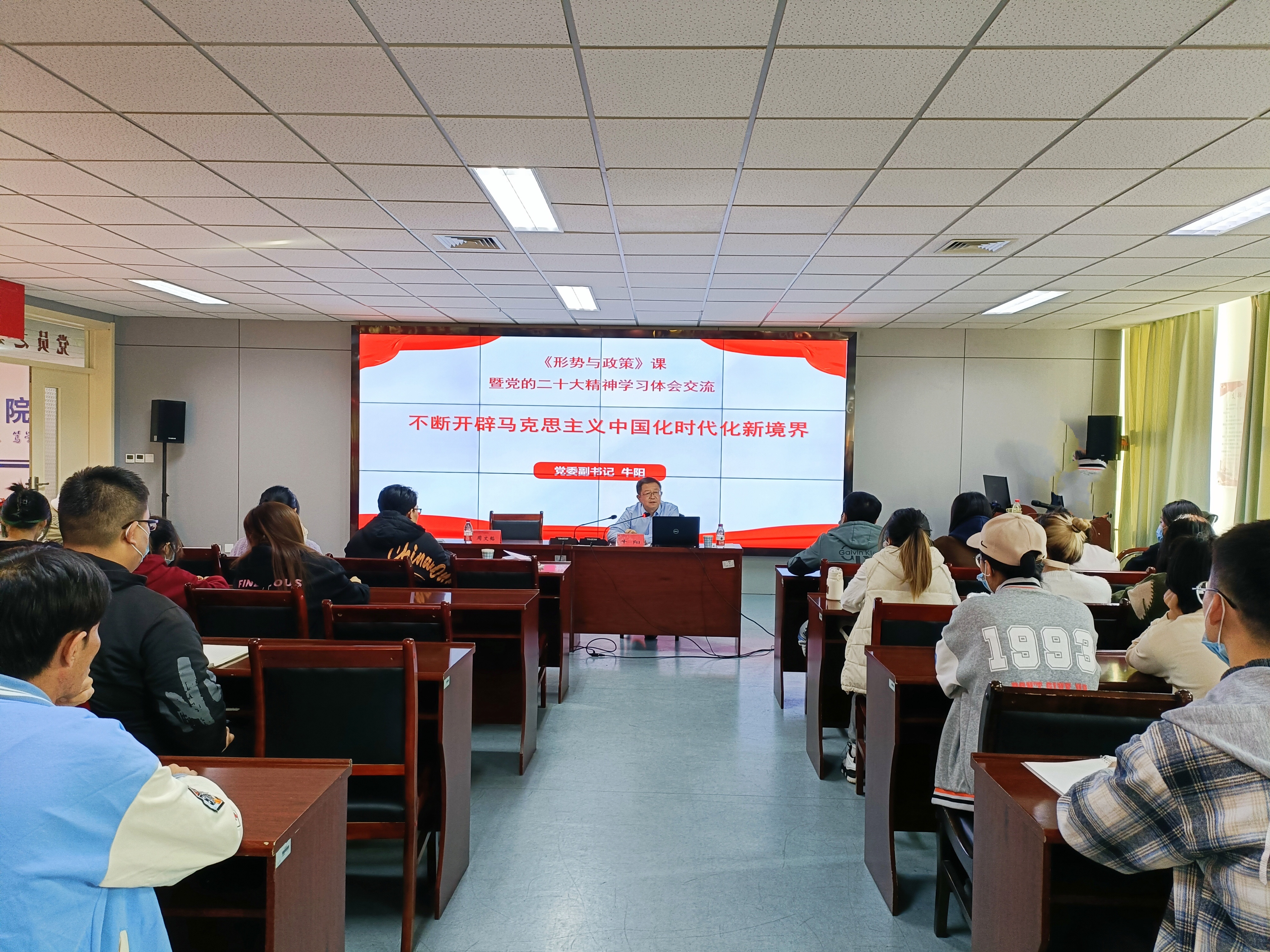 牛阳以“不断开辟马克思主义中国化时代化新境界”为题,围绕党的二十大主题和报告的15个部分逻辑结构,重点从开辟马克思主义中国化时代化新境界的丰富内涵、根本依据、实现路径三个方面,从学理结构深入分析,从实践角度对比古今,为师生党员上了一堂生动的“形势与政策”课。他希望同学们深刻认识和把握习近平新时代中国特色社会主义思想的世界观和方法论,坚定对马克思主义的信仰,坚定不移听党话、跟党走,积极投身新时代的广阔舞台,立志做有理想、敢担当、能吃苦、肯奋斗的新时代好青年,敢于拼搏、勤奋学习,为实现全面建设社会主义现代化国家的奋斗目标努力奋斗,为实现中华民族伟大复兴贡献青春力量。