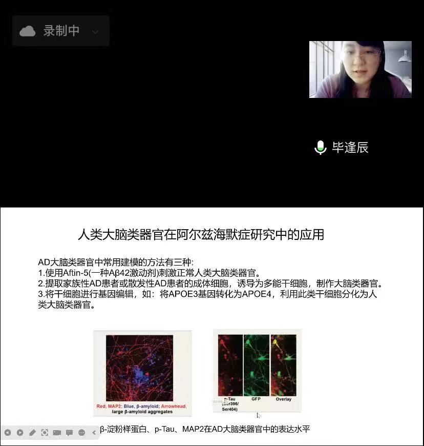 毕逢辰博士首先通过特征性病理表现向师生们介绍了阿尔兹海默症(AD)是一种神经退行性疾病,而研究模型是当下研究阿尔兹海默症的困境之一。毕逢辰博士分别从新型中枢神经系统模型人类大脑类器官的发展过程、大脑类器官的优势、人类大脑类器官在阿尔兹海默症研究中的应用、优化阿尔兹海默症人类大脑类器官模型、人类大脑类器官所涉及到的伦理问题等方面阐释了进行大脑器官相关研究的科学意义和紧跟前沿学术方向的必要性。