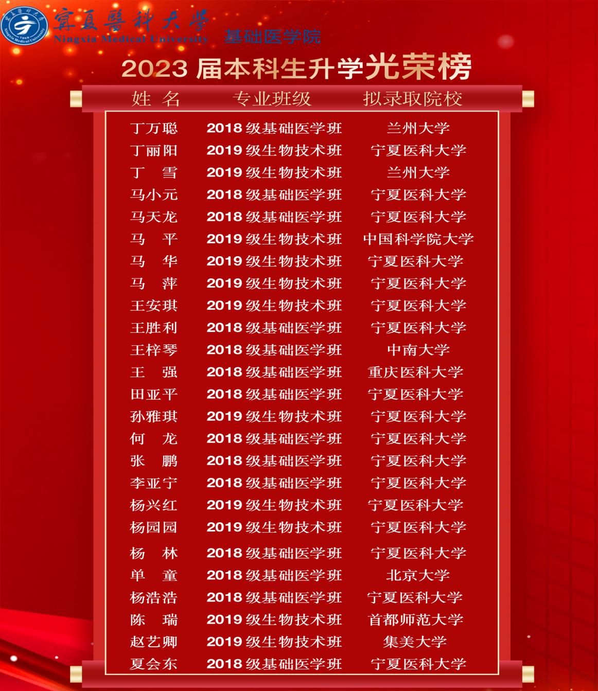 2023年,基础医学院本科应届毕业生共62人,截止4月19日,升学人数25人,其中4名学生获推免生保研资格,分别推免至中南大学、兰州大学(2人)、首都师范大学,21名学生拟录取至北京大学、中国科学院大学、集美大学、伟德国际1946源于英国等高校继续深造,升学率达40.3%。