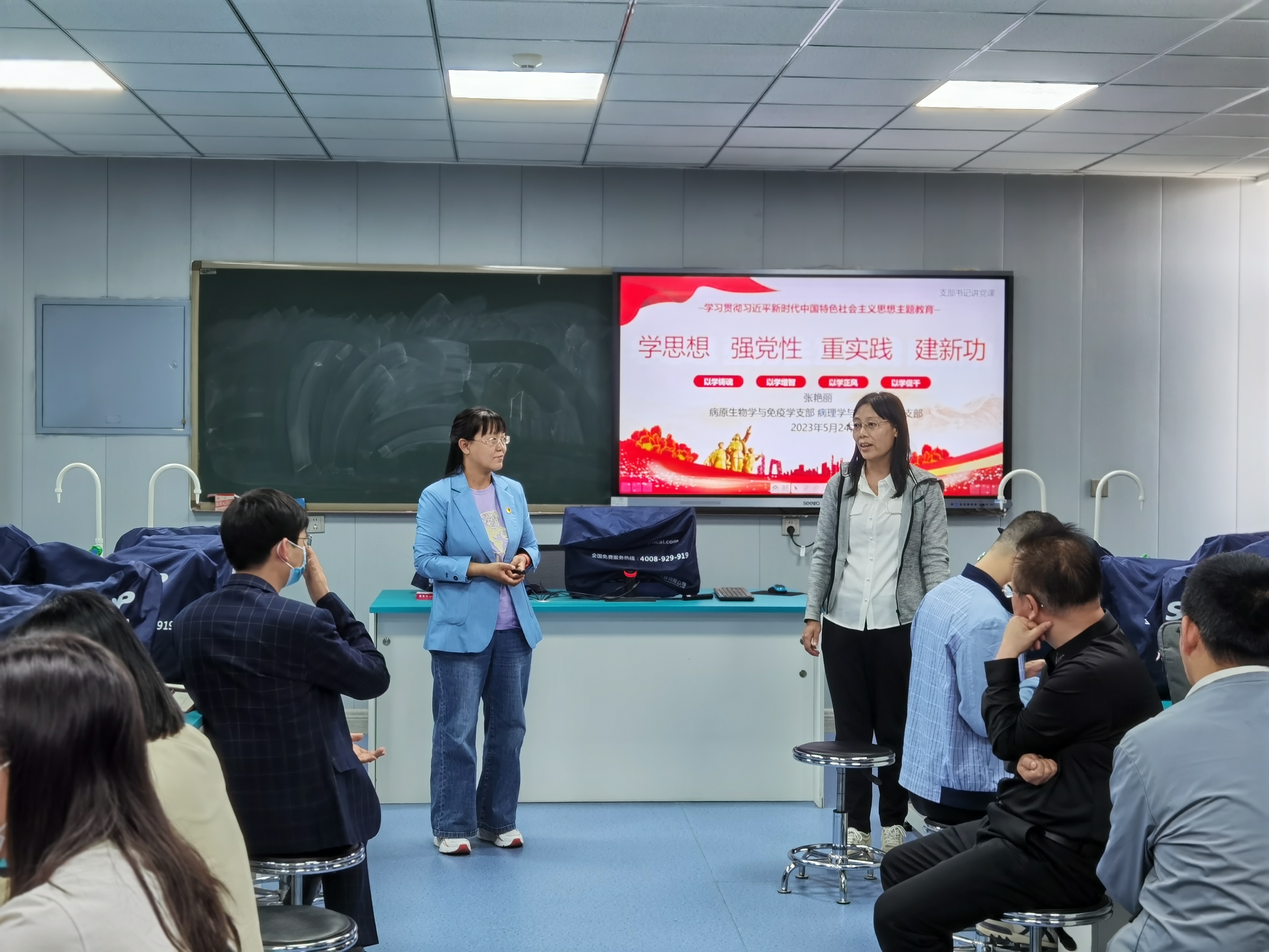下午,病原生物学与免疫学支部联合病理学与病理生理学支部,在实验教学楼405室,由支部书记张艳丽同志讲微党课,学习贯彻习近平新时代中国特色社会主义思想。学习中有三位党员教师和一名入党积极分子教师分别结合自己教学和科研工作,进行了交流讨论。大家表示,要以主题教育为契机,守正创新,立德树人,在学校高质量发展中发挥人才优势,贡献聪明才智。
