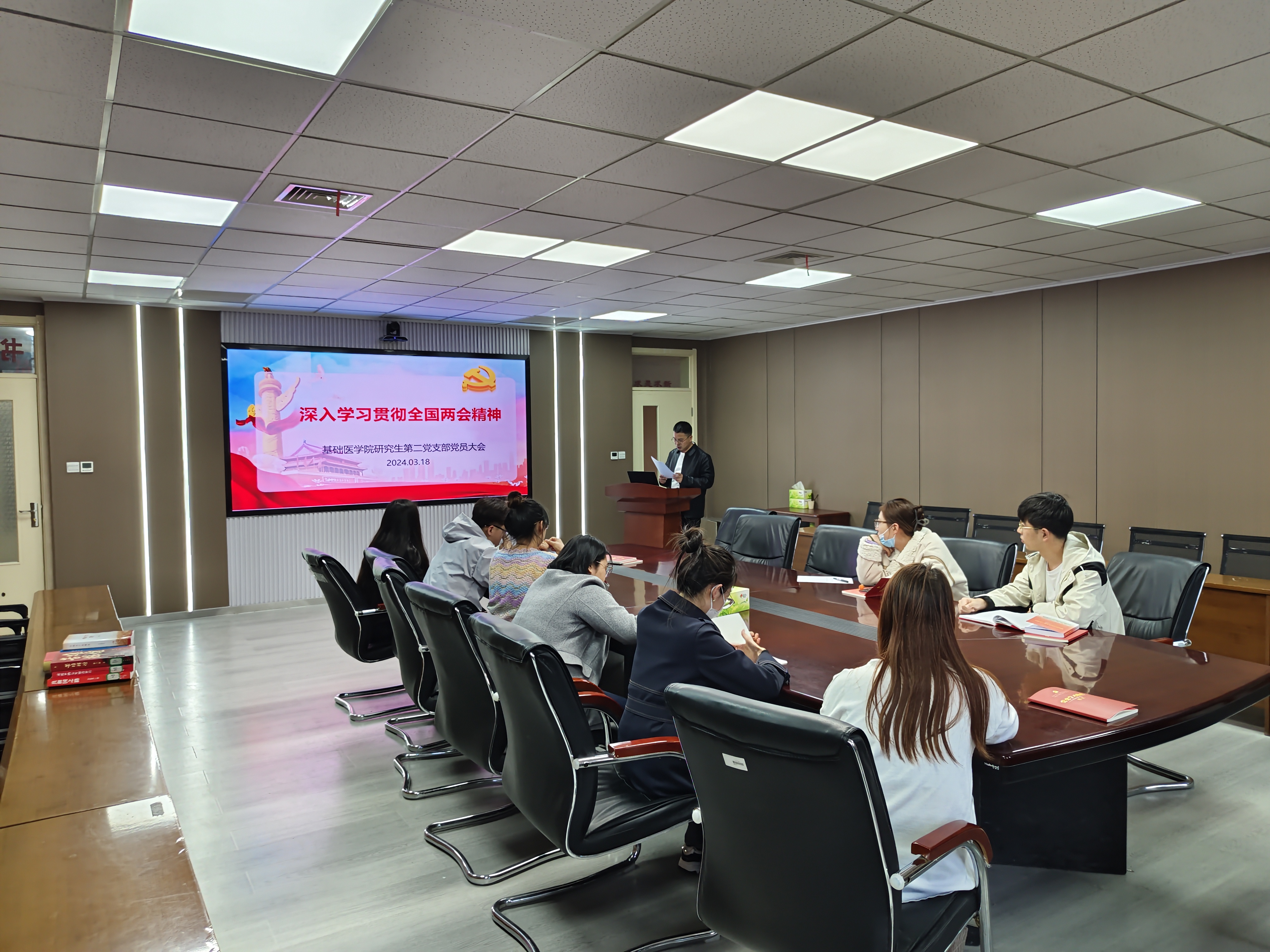 近日来,基础医学院党委各支部、学系、实验室、班级纷纷开展支部大会、主题党日、讲党课等活动,传达学习习近平总书记重要讲话和全国两会精神,先后集中学习了《习近平总书记在全国两会上的重要讲话》《政府工作报告》等重要文件,观看了《春之声——习近平总书记出席2024年全国两会纪实》《习近平在参加江苏代表团审议时强调 因地制宜发展新质生产力》,让广大师生进一步锚定目标、持续发力,为推进学院高质量完成2024年重点工作任务贡献智慧和力量。