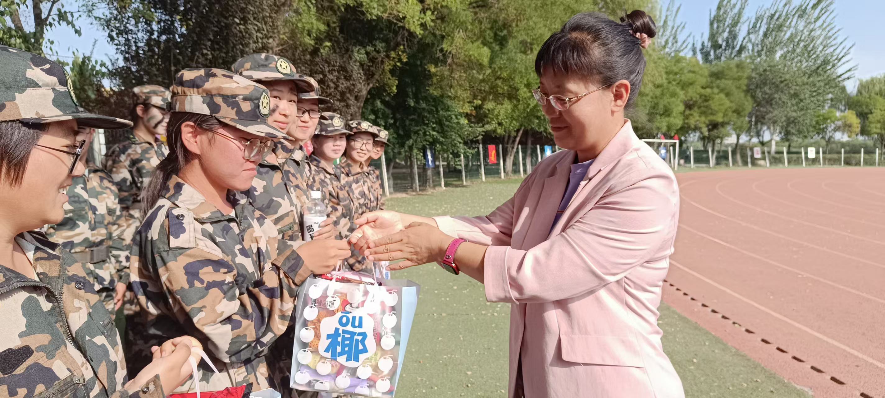 慰问现场,学院党委书记张艳丽代表学院向新生们致以亲切问候,对他们不畏酷暑、坚持训练的表现给予高度赞扬,充分肯定了大家在军训中展现出的青春朝气和坚韧意志。学院领导勉励同学们将军训视为大学的“开学第一课”,在烈日炙烤与队列训练中锤炼意志,在团队协作与互帮互助中凝聚集体力量,既以军人的严明纪律规范言行,又以医者的仁心大爱涵养品格、践行初心。学院领导还一起为同学们分发了慰问品,与大家亲切交流,细致询问饮食、住宿和身体适应情况,叮嘱训练务必注意规范和安全,遇到困难及时向老师或教官反映。一份份精心准备的礼物让新生们脸上绽放出灿烂的笑容,感受到学院的关心关爱,大家纷纷表示,将继续以饱满的热情和昂扬的斗志完成后续训练任务。