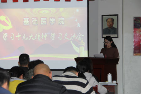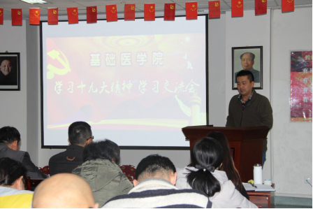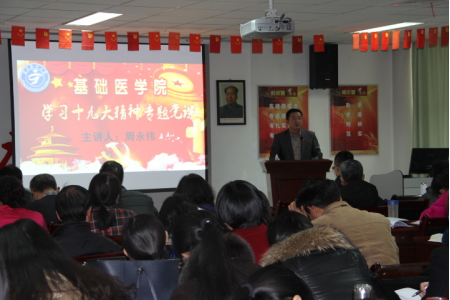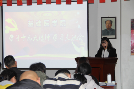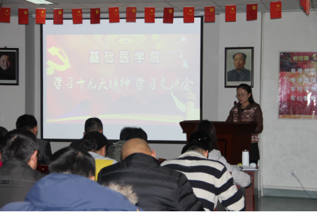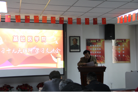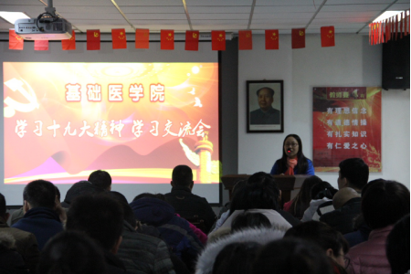 12月13日下午,基础医学院党委召开了学习宣传贯彻十九大精神专题活动,此次活动包括交流发言、党章修订案学习、专题党课等形式。全院教职工和学生党员参加了学习会。