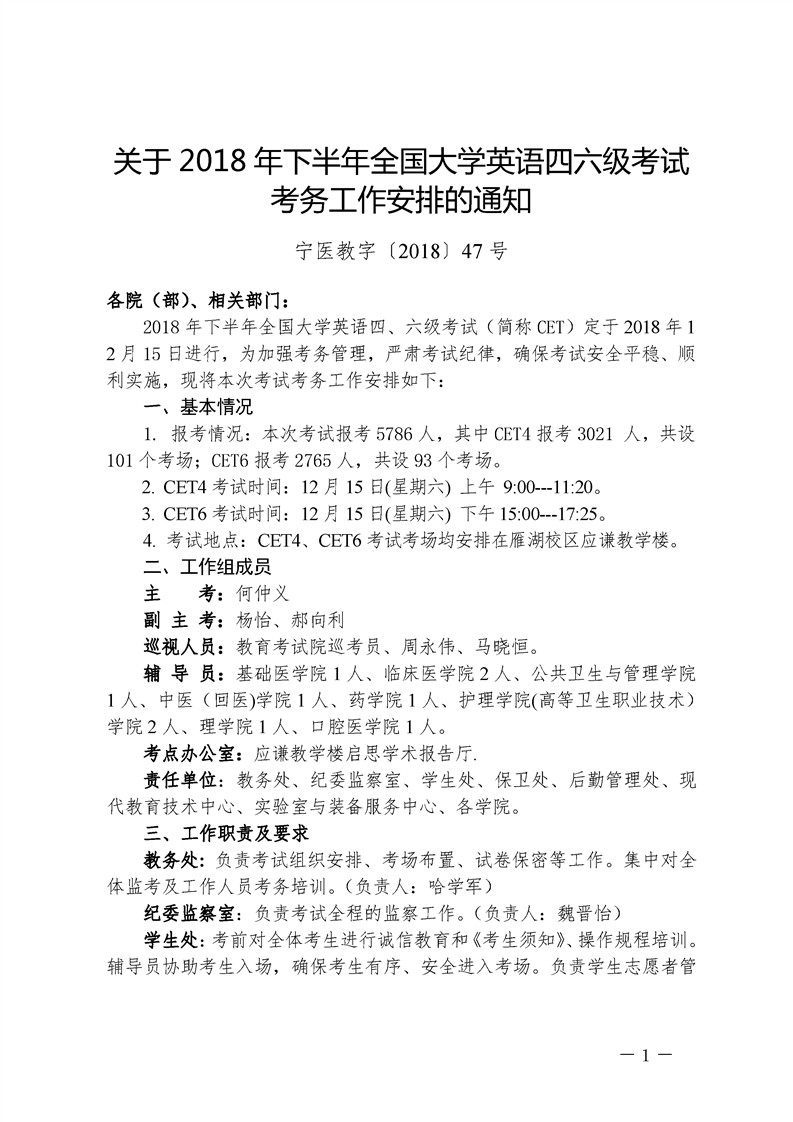 关于2018年下半年全国大学英语四六级考试 考务工作安排的通知