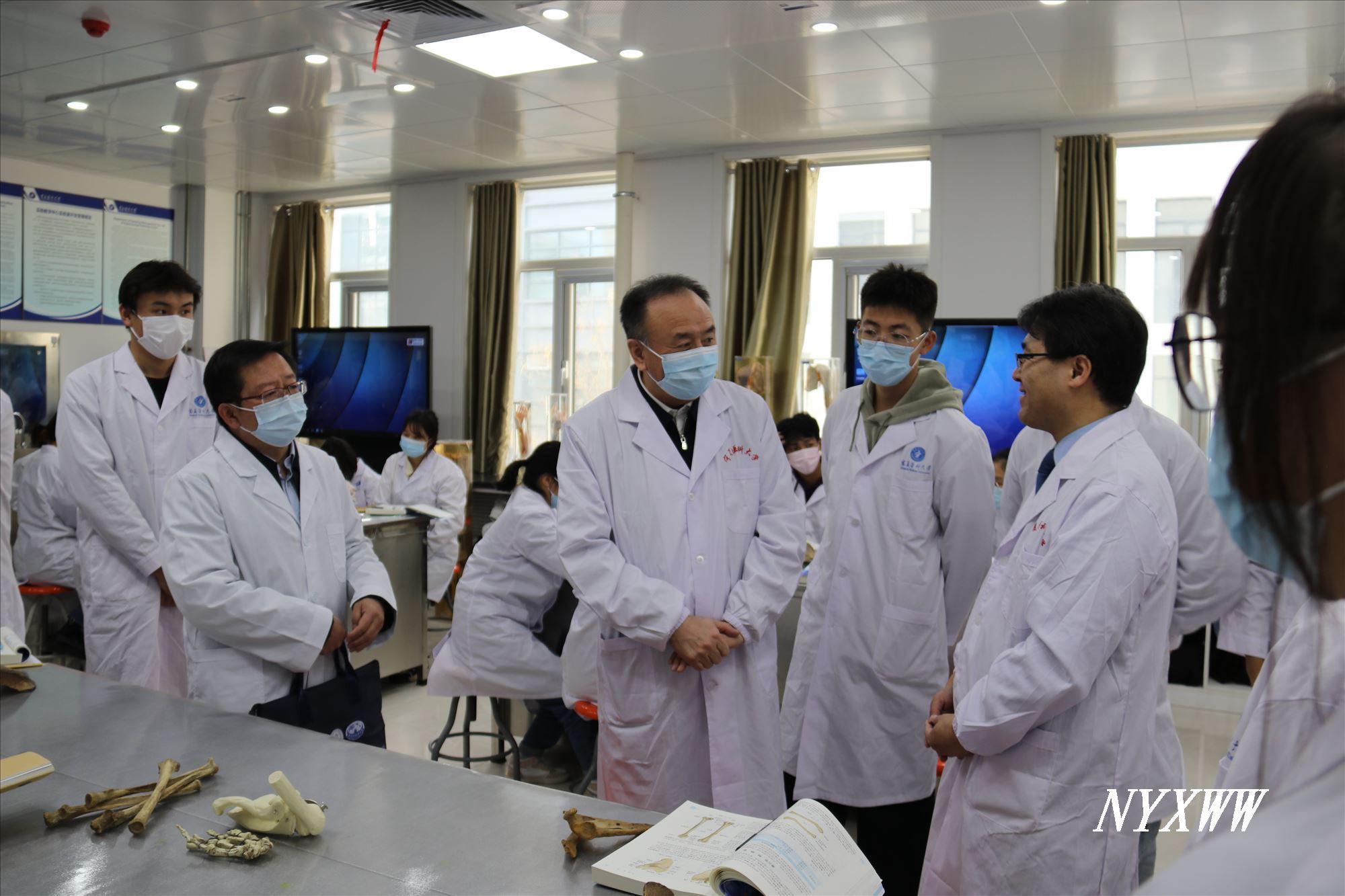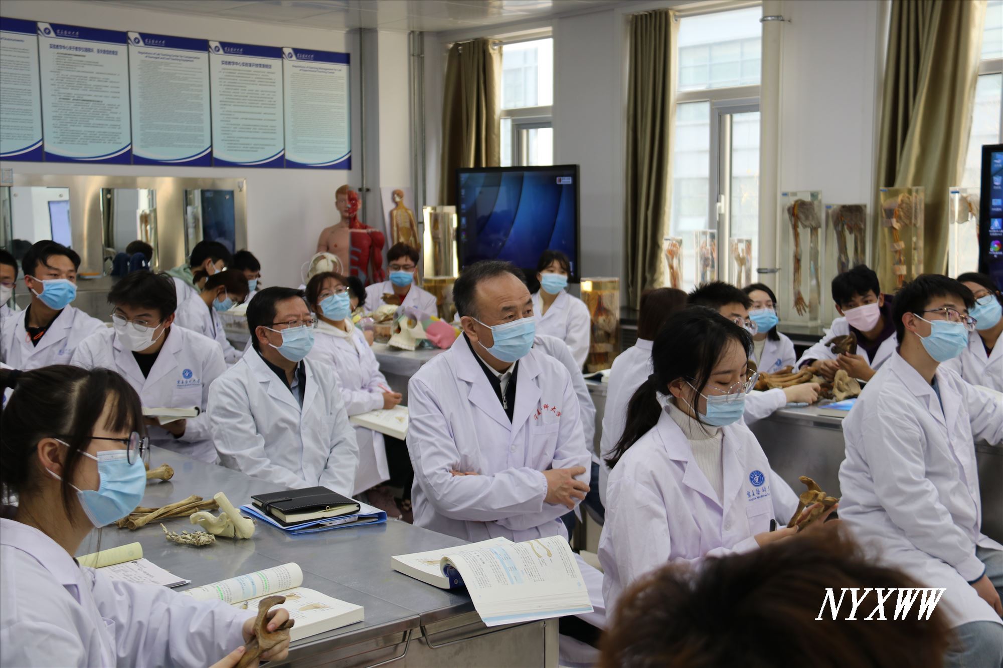 开学伊始,党委书记田丰年、党委副书记牛阳及办公室、教务处、质控中心、基础医学院等相关部门负责人在新解剖楼参加了《人体解剖学》开学第一课,与学生共同向“无言良师”致敬,随后认真听了张义伟副教授讲授的《人体解剖学》课,并在课后与师生进行了亲切地交流。他讲到,新的解剖实验室建设结合了现代教育技术,数字化、智能化的教学条件给原来枯燥的解剖课赋予了更丰富的内涵,补充了传统教学手段、方法的不足,丰富了解剖学的教学内容。《人体解剖学》是医学的重要基础课,老师在讲授时一定要和临床有所融合,让学生早接触临床。现在学校的教学条件、环境大幅度提升,希望同学们珍惜现在良好的学习条件,刻苦勤勉,努力学好这门课,为今后的专业知识学习打好基础,努力成为一名医者仁心的优秀医生。