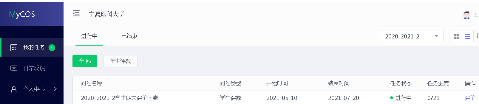 登录后,点击【我的任务】,查看【未完成】任务中的问卷,点击问卷即可参与评价。