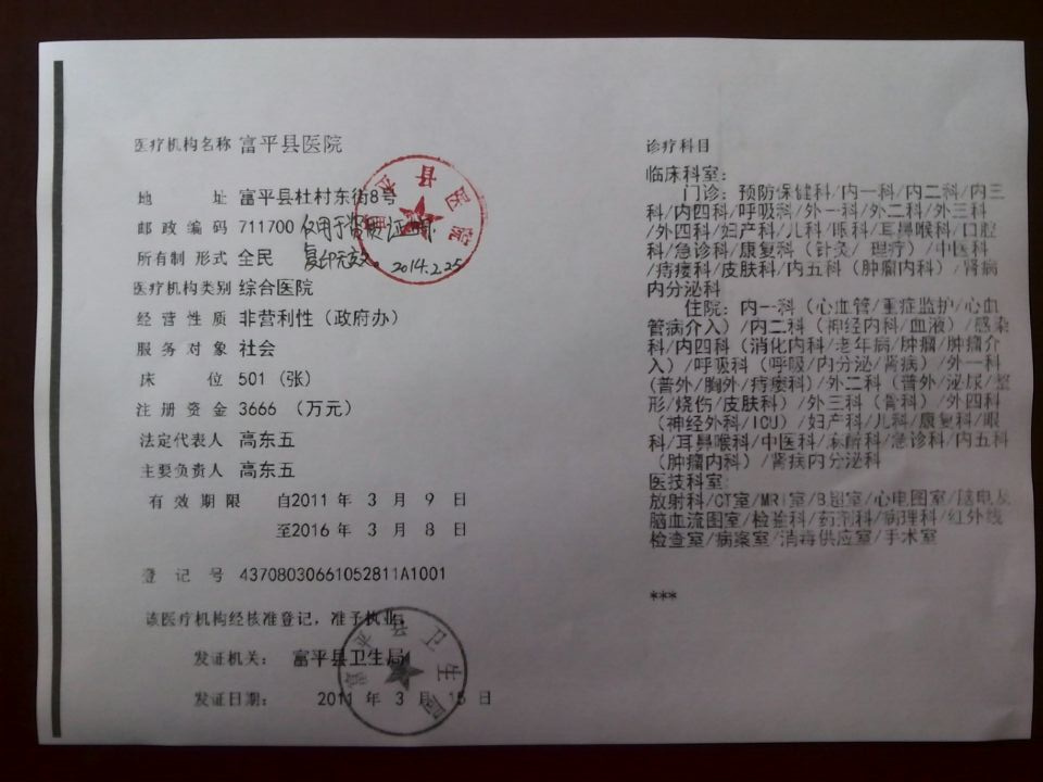 富平,地处陕西关中,一代伟人习仲勋故里,全县人口80余万。医院位于县城中心,交通便利、环境幽雅、设施齐全,是一所花园式综合医院,承担着全县及周边县市近百万人口的医疗、预防保健、急诊急救任务。多年来,医院始终坚持以“以人为本”的服务宗旨,坚持以“科技兴院、质量立院、人才强院”的发展战略,医院占地45356平方米,建筑面积35000平方米,固定资产总值上亿元。设置床位506张,实际开放床位600余张,年门诊量30万余人次,住院病人2.7万余人次,手术5500多台。2013年业务收入突破2亿,超额完成全年目标任务。目前,医院现有职工866人,卫生技术人员694人,其中高级卫生专业技术人员79人,中级137人;设置临床科室19个,医技科室8个,行政职能科室13个。