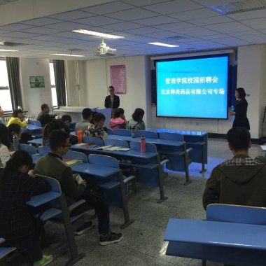 10月16日早上10点,在雁湖校区厚生楼202教室召开了管理学院企业家校园行讲座暨2016届毕业生首场就业招聘会,学院与北京韩美药品有限公司宁夏分公司、中国电信宁夏分公司携手开展校园专场招聘会推介毕业生,会议由学院学办主任主持,70余名2015届毕业生参加。