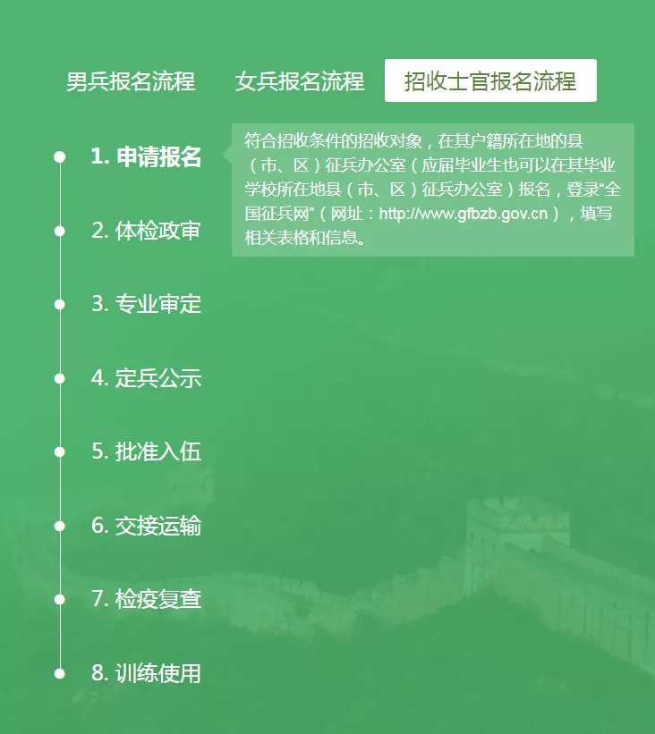 2.完成网上报名后,请密切关注网上审核结论,跟踪掌握应征报名进展情况(直招士官应征进展情况查询),保持通信联络顺畅,根据应征地兵役机关通知要求参加应征。