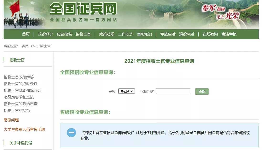 “招收士官专业信息查询(省级)”计划于7月初开通,请于7月初登录全国征兵网查询是否符合本省招收专业。