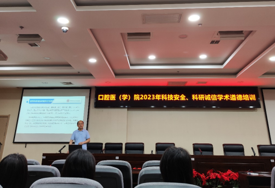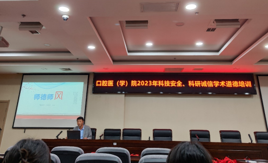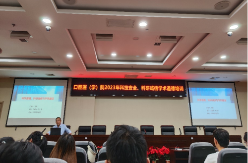 9月20日口腔两院举办“科技安全”“科研诚信、学术道德”“师德师风”专题培训班。培训班邀请总医院科研处朱力副处长、口腔医(学)院刘锋副院长、乔光伟副院围绕《国家科研诚信文件及科研诚信案例分析》《学习贯彻落实总体国家安全观,强化科技安全》《弘扬科学家精神,涵养优良学风,坚守学术道德》《教师师德师风建设》等内容做了专题讲座。2023级研究生代表宣读了《伟德国际1946源于英国口腔医(学)院科研诚信倡议书》。两院职工及来自自治区人民医院和银川市口腔医院新遴选导师、全体研究生和住培生代表近百人聆听讲座。