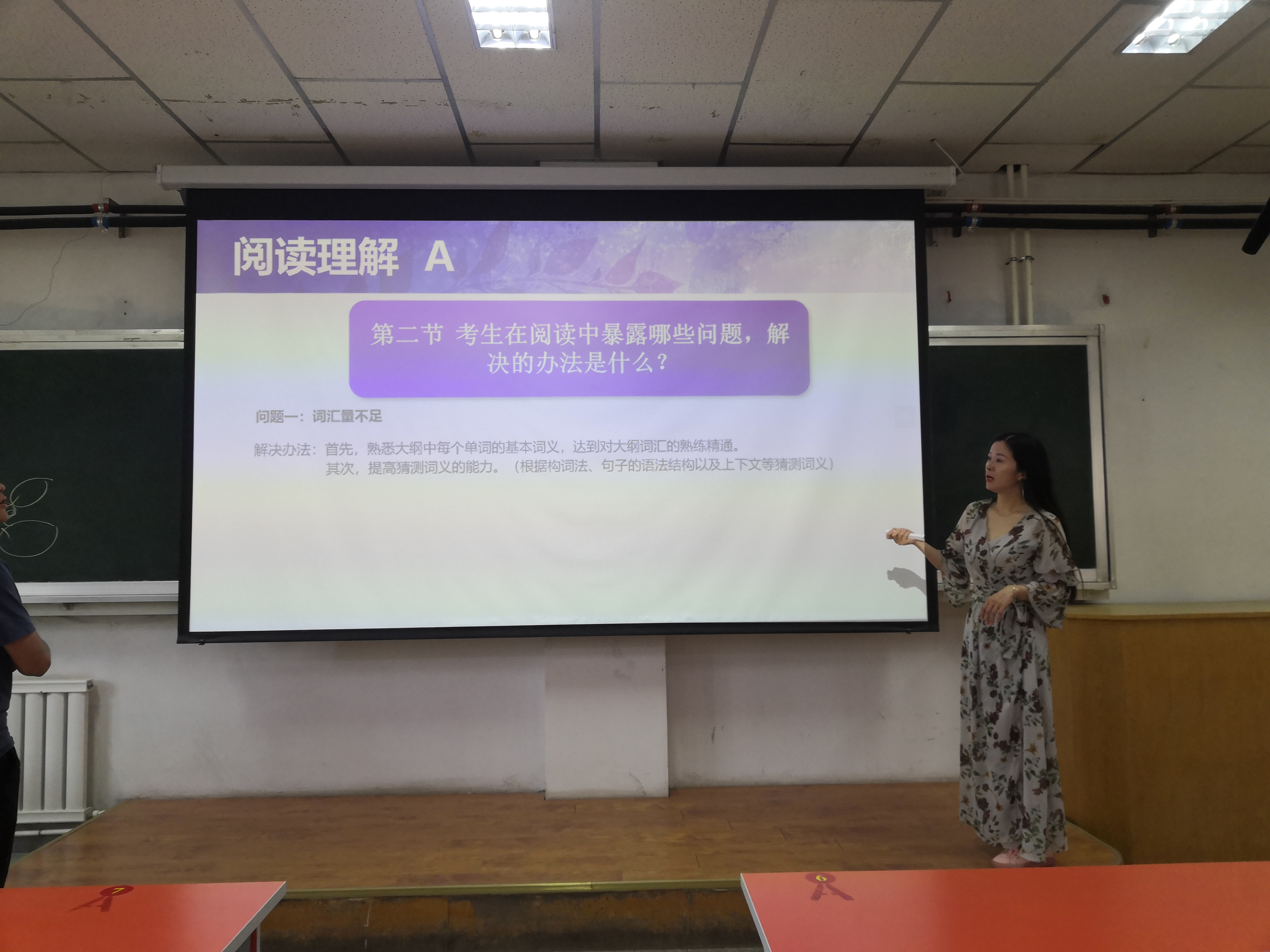 外国语教学部冯鸿莉老师精心准备安排了本次英语能力提升活动内容。首先,老师结合真题来讲解英语考试模块、组成以及主要的知识点;其次,对即将到来的英语各类考试的同学们做了英语解题初步构想,鼓励同学们认真对待;最后,大家互相学习、相互探讨,冯老师也进一步提出了下半年英语复习规划以及复习重点。