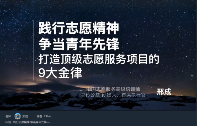 为激励广大口腔学子积极投身志愿服务活动,不断提升活跃志愿服务的常态化、社会化、规范化水平,值此“向雷锋同志学习”59周年、第23个“中国青年志愿者服务日”到来之际,口腔医学院于3月3日19点在钉钉线上举办了“践行志愿精神,争当青年先锋”的培训讲座。此次讲座有幸邀请到中国志愿服务高级培训师、宁夏驼铃公益文化传播中心首席执行官邢成老师,为学院全体在校生分享金奖志愿服务项目的9大金律。