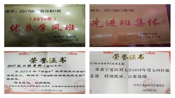 曾获得“优秀班集体”、“五四红旗团支部、“雷锋月先进团支部”、“十佳团日活动”、“优良学风班集体”等荣誉称号。班级及同学曾获奖:大学生创新创业计划校级一等奖,第九届全国大学生电子商务“创新、创意及创业”挑战赛宁夏赛区省级选拔赛三等奖,第九届全国大学生电子商务“创新、创意及创业”挑战赛宁夏赛区省级选拔赛最佳创新奖,区级三好学生等,累计获得国家励志奖学金8人次,校长特别奖学金1人,其中赴空军军医大学交流2人,赴四川大学华西口腔医学院交流2人。2020年疫情期间,学院同学积极配合学校、学院各级工作安排,在各自家乡充分发挥大学生、医学生作用。