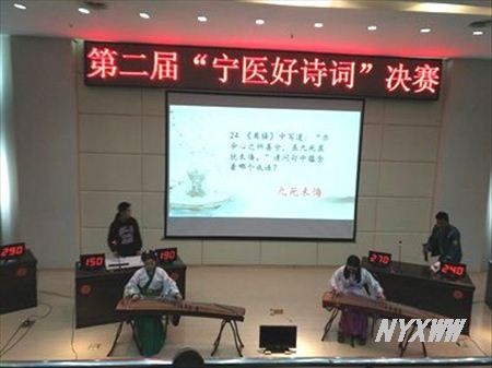 此次活动有全校范围内的200余名同学经过了初赛和复赛,最终8组选手入围决赛,为大家献上了一场精彩的诗词文化大餐。决赛中,八组选手从金戈铁马,到琴棋书画;从大漠孤烟,到水墨江南;从忠肝义胆,到千里婵娟;经常规题、飞花令、不可言传、风险抢答等环节的精彩角逐,最终第二组王鲜诚、张建同学获得“状元”称号,第五组茆晶晶、王芳同学获得“榜眼”称号,第六组孙剑飞、胡彩君同学获得“探花”称号。宁夏诗词学会副会长闫立岭老师分别为获奖选手颁奖。闫立岭老师还与在场的同学们分享了自己多年来创作诗词的经历和故事。