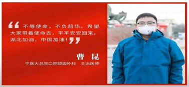 他是06级的一个温暖的大学长,也是口腔医学院口腔颌面外科的曹昆老师。本是家中少儿郎,却学兄长披戎装。一腔热血为人民,直别家乡入襄阳。到达襄阳的当天晚上他便主动要求值第一个夜班,50多个病人挨个熟悉挨个询问。第一天晚上他就认识到了病毒的无情和残酷,先后接收了6个确诊病例,前有未熟悉完的病人后有新收的确诊人群,等忙完这些工作,已经是凌晨6点钟,脱下防护服全身都是湿的。不分昼夜的工作成了抗击病毒的常态,深夜的视频会议也成了家常便饭,及时与总医院视频会诊,共享数据为家乡抗击疫情做出积极努力。他和战友们经过连续20多天的艰苦努力,终于当地的确诊人数连续多日为0增长。作为襄阳职业技术学院临时党支部书记领誓新党员发下的不仅是忠于祖国、忠于人民的誓言,也是作为一名医生健康所系性命相托, 不负使命,大医精诚的永恒誓言。