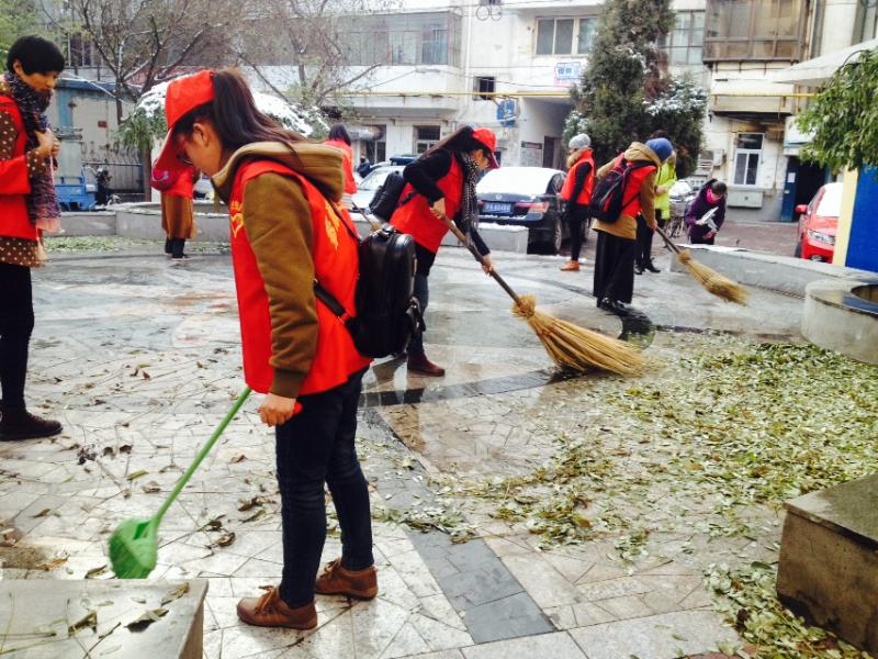 大雪过后的银川寒气逼人,但依旧不敌同学们高涨的热情,雪地中鲜艳的“小红帽”似一团团火焰,温暖寒冬。活动开始,共40名志愿者团队分为两组分头行动。同学们分工明确,或打扫庭院落叶,或捡拾社区垃圾,或清理堵塞楼道,大家发扬不怕苦,不怕累的雷锋精神,积极认真的投入到义务劳动之中。经过两个小时的清理,社区环境焕然一新。社区工作者对同学们的此次义务奉献给予了高度的赞扬和肯定。