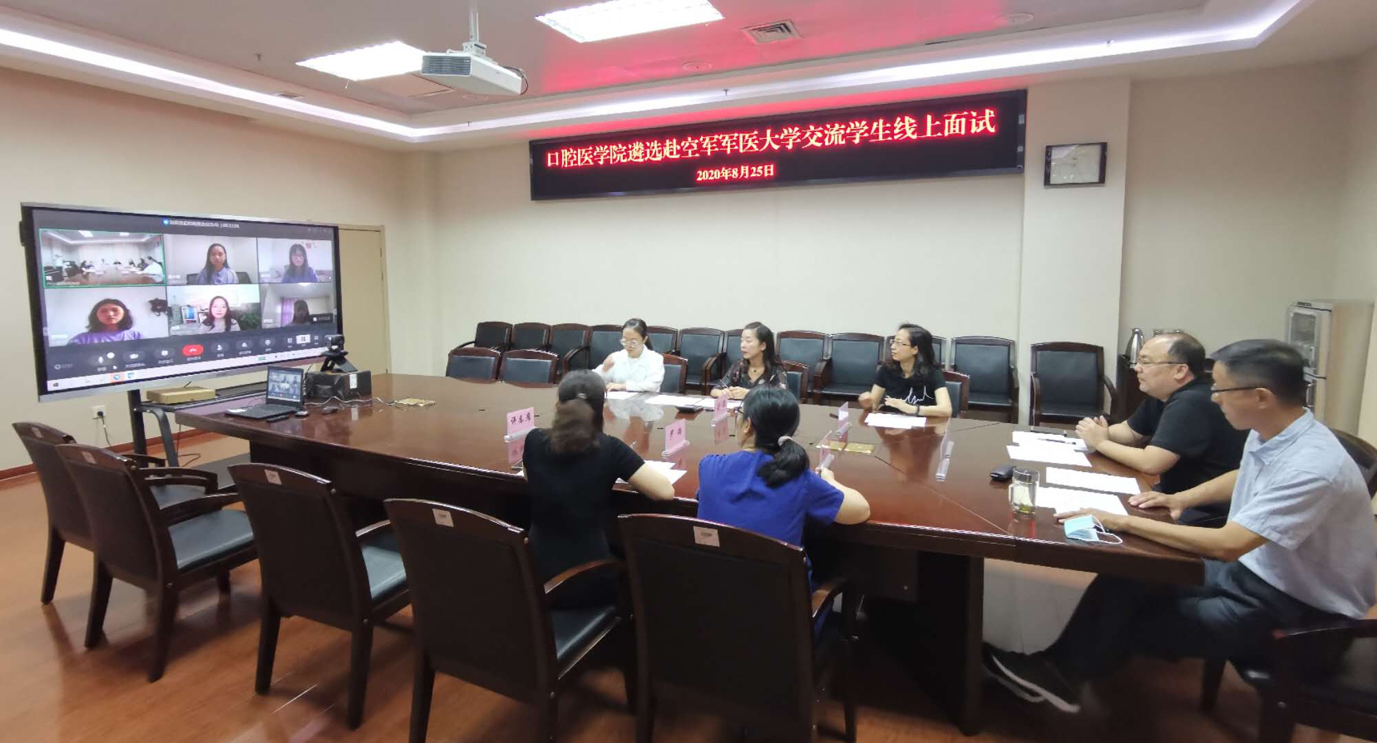 根据口腔医学院与空军军医大学联合培养本科生协议相关要求,为公平公正地选拔优秀学生赴该校交流学习,8月25日,我院举办了赴该校交流学生线上遴选面试活动。学院党委书记赵峥、院长黄永清、党委副书记王云及学工办、教学办负责人和学生代表共七人担任评委,经过前期的自愿报名、资格审核,共有五位同学参加了这次线上遴选。
