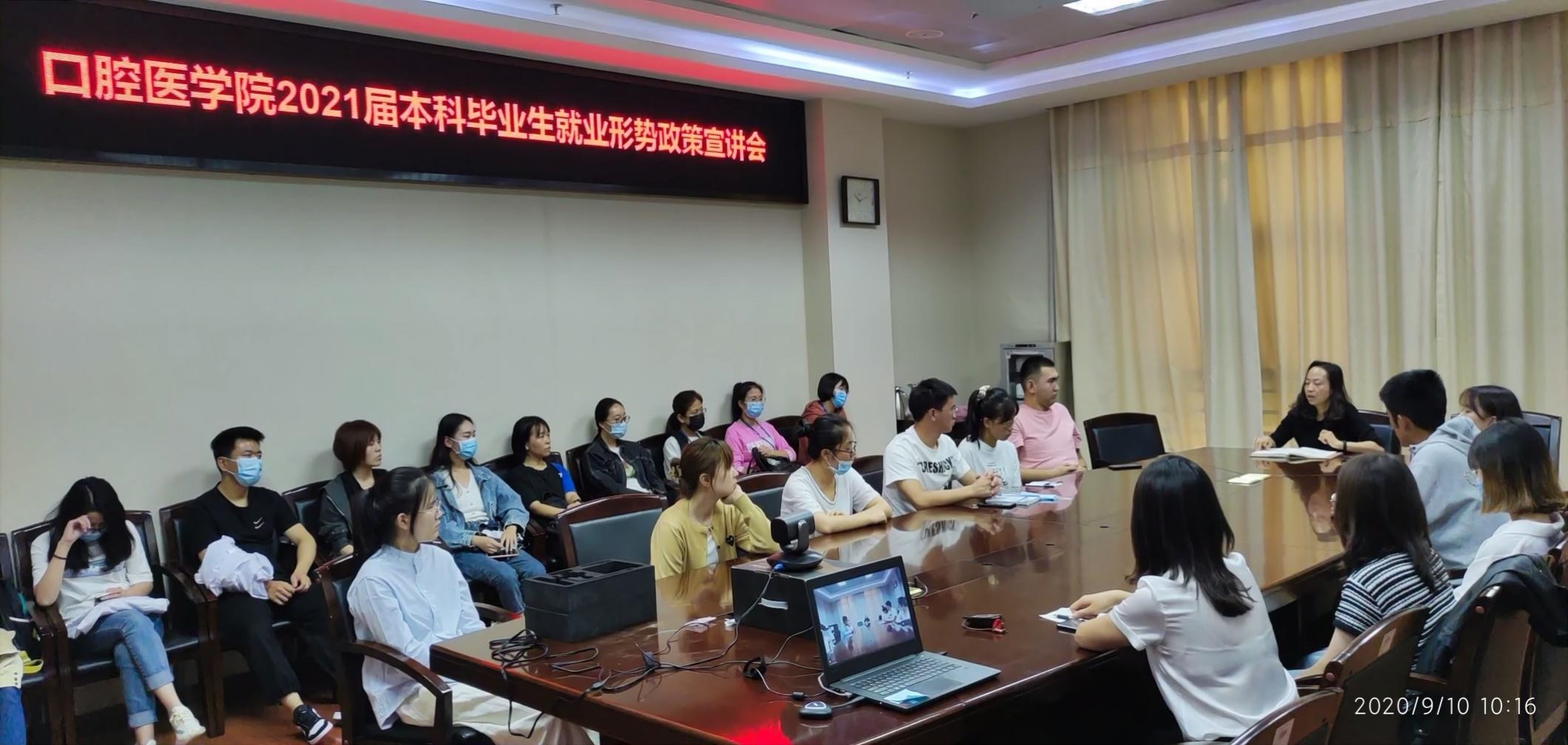为推动学院2021届毕业生就业工作,帮助毕业生转变就业观念,拓宽就业渠道,2020年9月10日上午,在口腔医学院第一会议室举办了“2021届毕业生就业政策宣讲会”。本次讲座特别邀请到了学院黄永清院长、王云副书记为同学们就业、考研进行辅导。共有100余名毕业生分别通过线上线下相结合的形式参加了讲座。