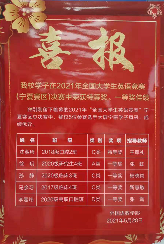 2021年全国大学生英语竞赛(宁夏赛区)决赛结果揭晓,2018级口腔二班沈淑琦同学与2020级高职口腔班李嘉伟同学从众多参赛者中脱颖而出,分别夺得特等奖与一等奖,成为伟德仅有的五位获奖者之二,彰显青春力量,绽放口腔风采。