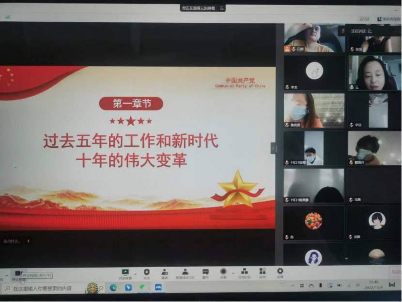 口腔医学院党委副书记王云通过腾讯会议对党的二十大报告进行了解读,内容包括过去五年的工作和新时代十年的伟大变革;开辟马克思主义中国化时代化新境界;新时代新征程中国共产党的使命任务;实施科教兴国战略,强化现代化建设人才支撑等。她希望全体党员把党的二十大精神学深研透,并运用到实践中,同时,在日常的学习生活中发挥引领作用,向同学、基层群众讲好党的故事,用同学们喜闻乐见的形式传播真理,同时传播当代青年好声音。