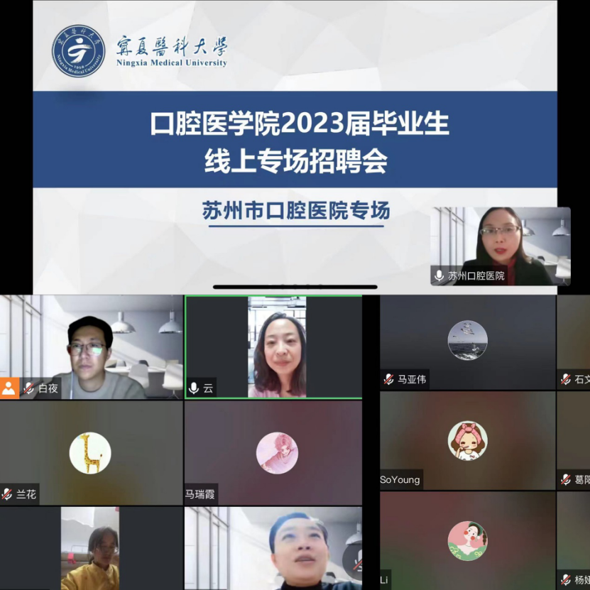 为了更好地促进毕业生就业,我院于12月8日晚举办了2023届毕业生首场线上专场招聘会,邀请苏州口腔医院进行招聘宣讲。会议由学生工作办公室主任尹璐主持,学院党委副书记王云出席会议,2023届全体硕士毕业生参加。
