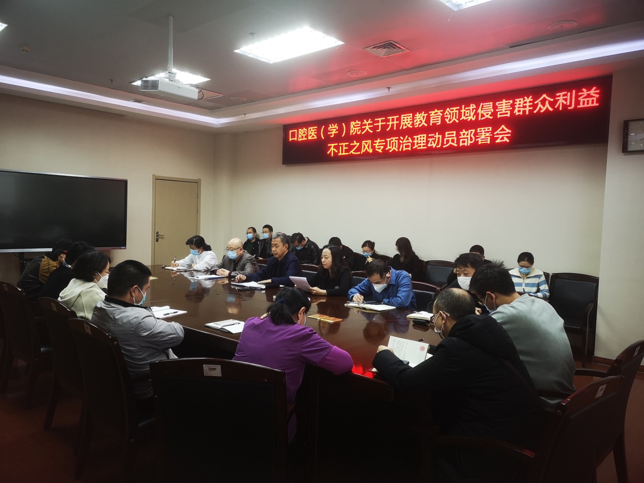 3月21日,口腔医(学)院召开“开展教育领域侵害群众利益不正之风及纠治形式主义官僚主义专项整治专项整治”启动大会。口腔两院院级领导,各党支部书记,各职能部门正副主任,临床科室正副主任、正副护士长、科室负责人,硕士生导师、全体专职教师参加了会议。