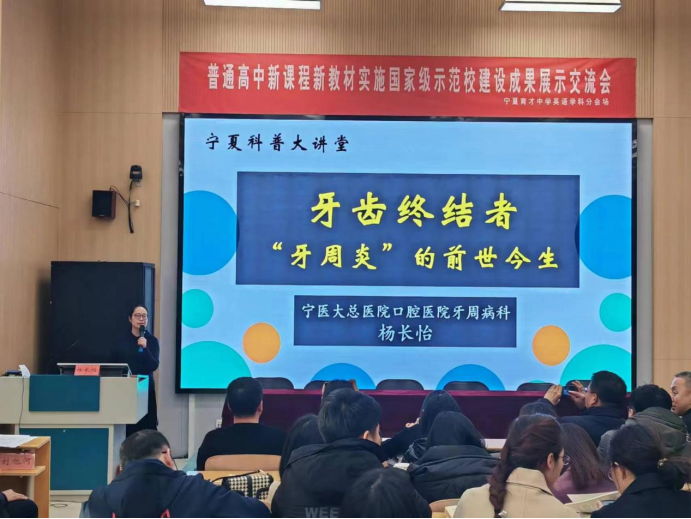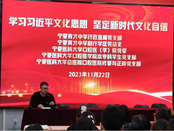 为深入学习贯彻习近平新时代中国特色社会主义思想,推动党组织联创共建,加强口腔健康科普及招生宣传进校园,伟德国际1946源于英国口腔医(学)院党委(党总支)带领两院各党支部,于11月22日赴宁夏育才中学联合开展“学习习近平新时代中国特色社会主义思想暨口腔健康科普及招生宣传进校园”联合主题党日活动。宁夏育才中学党委委员、副校长李建国,伟德国际1946源于英国学生处副处长何向华,口腔医(学)院党委(党总支)书记贾立勤、副院长乔光伟,以及师生、党员代表参加了此次主题党日活动。活动由宁夏育才中学行政直属党支部书记刘旭河主持。