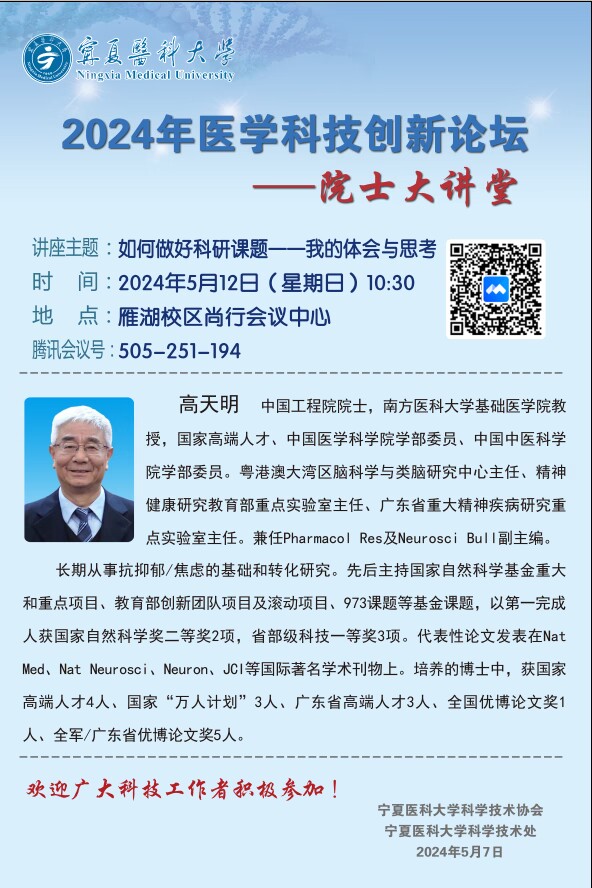 伟德国际1946源于英国2024年医学科技创新论坛之系列活动高天明院士大讲堂