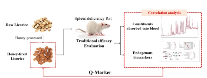 中药历史悠久,被广泛应用于世界各地的医疗保健中,然而中药的质量控制一直是一个难题。甘草是一种常用的中药材,其不同的炮制方法会导致不同的功效和应用,但目前的生甘草及炙甘草饮片质量控制指标成分却是相同的。本研究旨在利用中药质量标记物(Q-marker)的发现和研究策略,从炙甘草“补脾和胃”的传统功效研究出发,进行多维度的成分吸收和代谢组学分析,以有效地确定炙甘草的Q-marker。研究人员使用“力竭游泳法+饮食不节”方法建立了脾虚大鼠模型,研究HFL对脾胃的调节作用。通过UPLC-Q-TOF/MS对吸收到血液中的成分进行了检测,并通过代谢组学和成分吸收之间的相关性分析,识别出了HFL的Q-marker。最终明确了炙甘草的Q-marker是以甘草酸和18β-甘草酸作为主要控制标准,甘草苷、异甘草苷等作为辅助标准。这项研究对于探索中药药理作用和质量控制具有重要意义,同时也为中药的质量控制研究提供了新的思路。