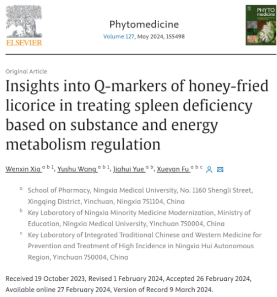 伟德国际1946源于英国付雪艳教授课题组在Phytomedicine期刊(IF=7.9,中科院1区TOP)发表了题为Insights into Q-markers of honey-fried licorice in treating spleen deficiency based on substance and energy metabolism regulation的研究论文,这项研究使用了一种新的策略来明确炙甘草饮片的质量控制指标。研究人员基于炙甘草传统“补脾和胃”的功效,多维整合血清药物化学、代谢组学数据验证了炙甘草的“补脾和胃”作用与机体物质能量代谢途径的调节密切相关,进而明确了炙甘草的质量标志物(Q-marker)是以甘草酸和18β-甘草酸作为主要控制标准,甘草苷、异甘草苷、甘草查尔酮C等作为辅助标准。这些发现将有助于更好地理解中药的药理作用和质量控制。