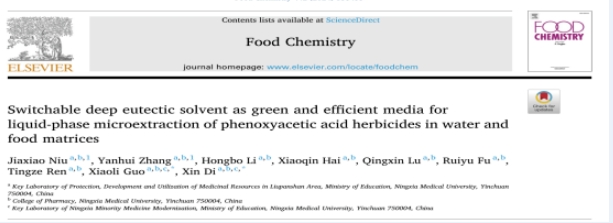 伟德国际1946源于英国邸欣副教授课题组在 “Food Chemistry” 期刊(中科院一区TOP,IF=8.8)发表了题为 “Switchable deep eutectic solvent as green and efficient media for liquid-phase microextraction of phenoxyacetic acid herbicides in water and food matrices” 的研究论文,揭示了基于脂肪酸和聚醚胺离子对的可切换低共熔溶剂(SDES)用于饮用水、饮料和蜂蜜中苯氧乙酸类除草剂的富集分析,该方法具有绿色、高效、简便等优点,在复杂样品基质中痕量组分的检测分析方面表现出优异的应用潜力。