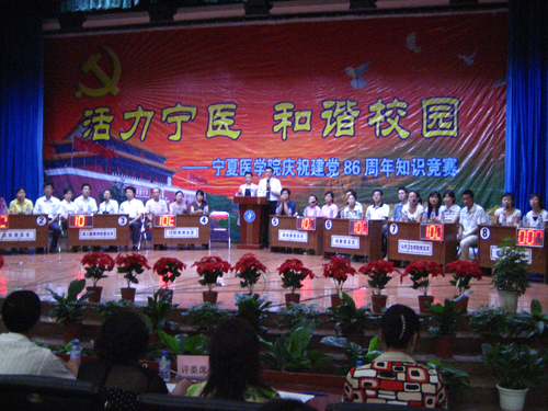 为庆祝中国共产党成立86周年和香港回归祖国10周年,迎接党的十七大和自治区第十次党代会的胜利召开,组织广大教职员工和学生认真学习马列主义、毛泽东思想、邓小平理论和“三个代表”重要思想,进一步掌握社会主义核心价值体系的基本理论和基本知识,筑牢人生思想道德根基,构建和谐校园,展示当代宁医人的精神风貌,2007年7月6日全校组织开展了“筑牢人生根基,构建和谐宁医”理论知识竞赛活动。