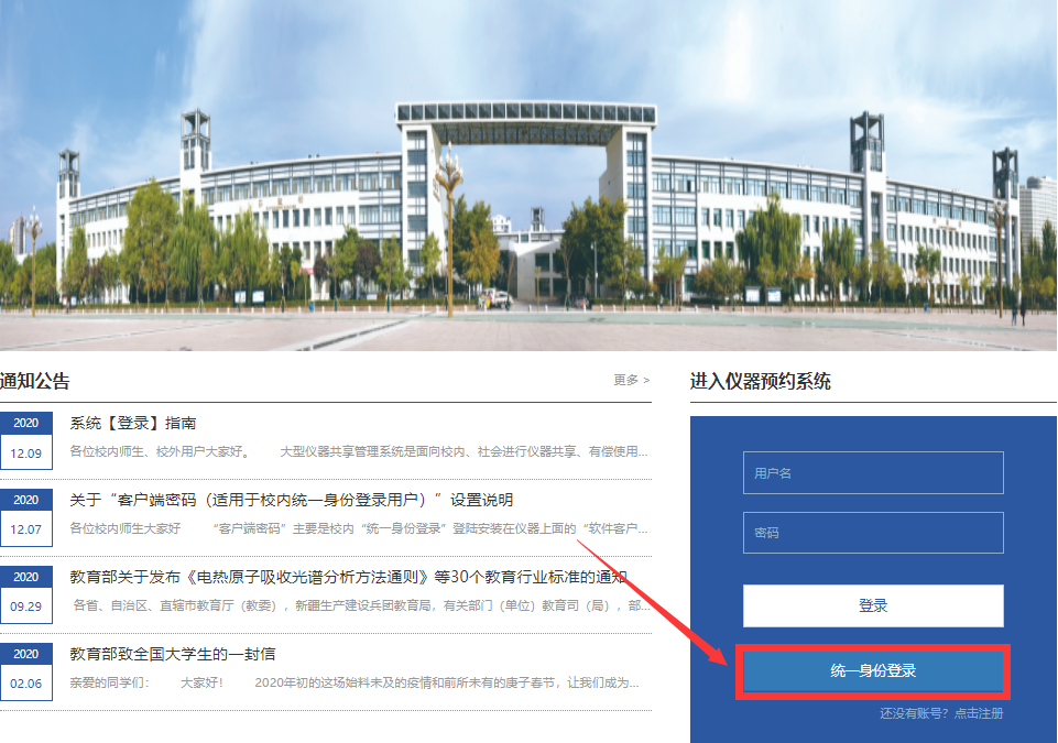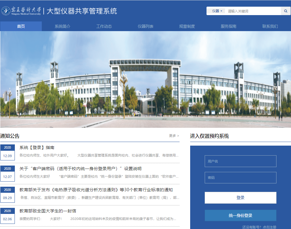 大型仪器共享管理系统是面向校内、社会进行仪器共享、有偿使用服务,为了满足校内师生和校外用户需求系统提供了两种登录方式: