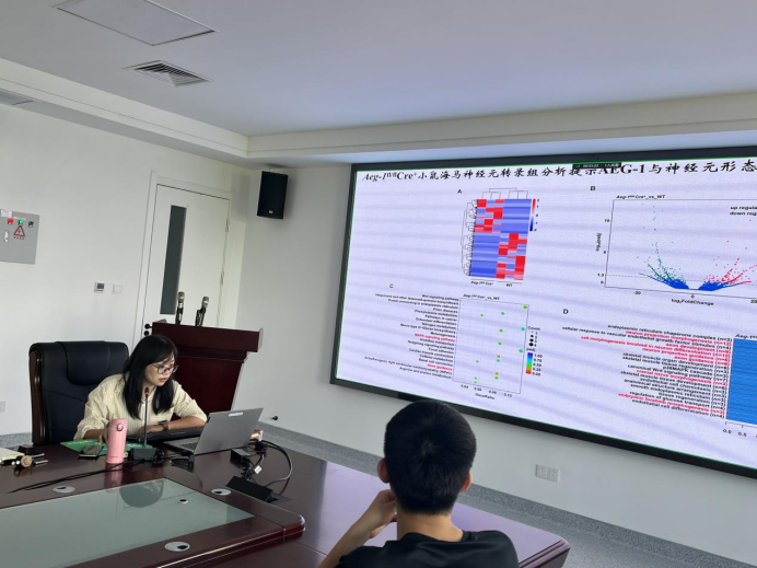 刘昆梅教授以“AEG-1在癫痫与认知中的作用研究”为题,从AEG-1功能、AEG-1敲除鼠的构建、相关形态学和电生理学的角度,展示了近期研究成果和相关内容;医学神经生物学2021级硕士研究生李娟娟做了“熊果酸联合丙戊酸钠改善癫痫大鼠认知作用的研究”的研究汇报,分享了其实验期间的研究内容和所取得的数据结果。
