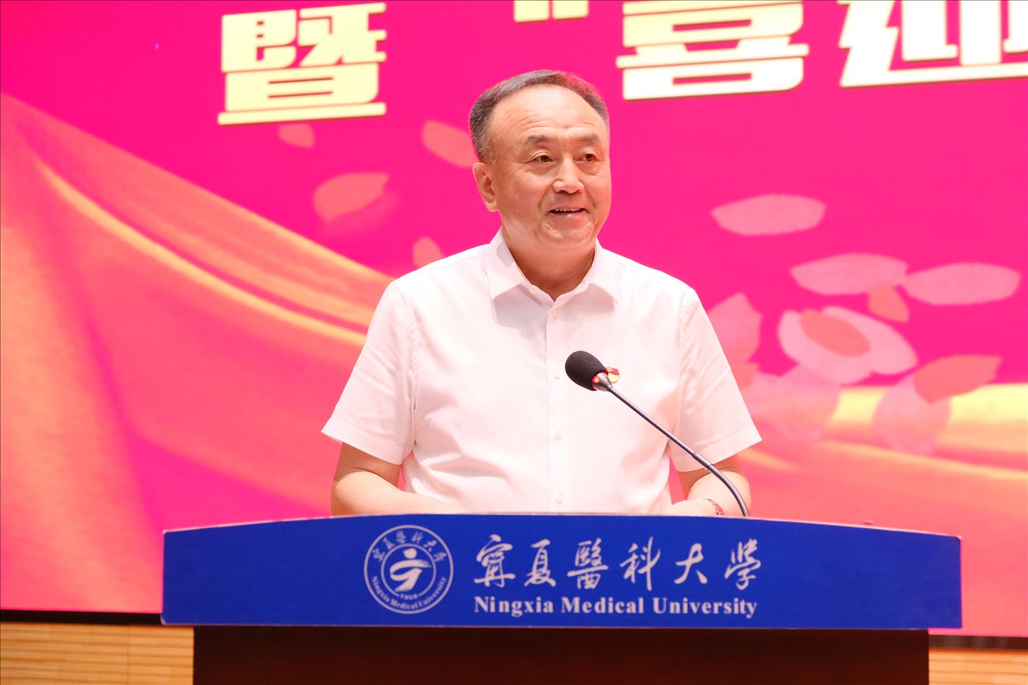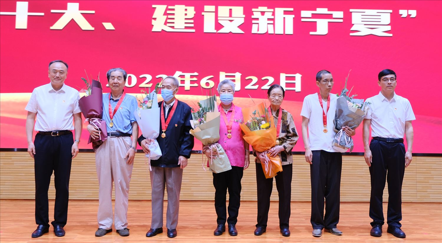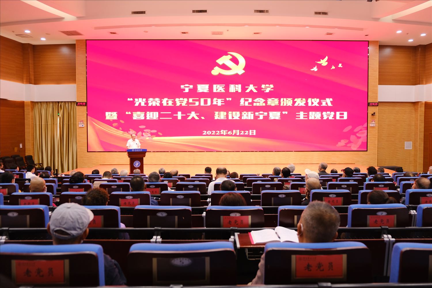 6月22日上午,学校在雁湖校区尚行会议中心举行“光荣在党50年”纪念章颁发仪式暨“喜迎二十大 建设新宁夏”主题党日活动。学校党委书记田丰年、校长姜怡邓、党委副书记牛阳、朱建华,总医院党委书记黄河,“光荣在党50年”的老党员和家属代表,学校和总医院离退休老党员代表,党支部书记代表、预备党员代表等150余名党员参加。活动由牛阳主持。