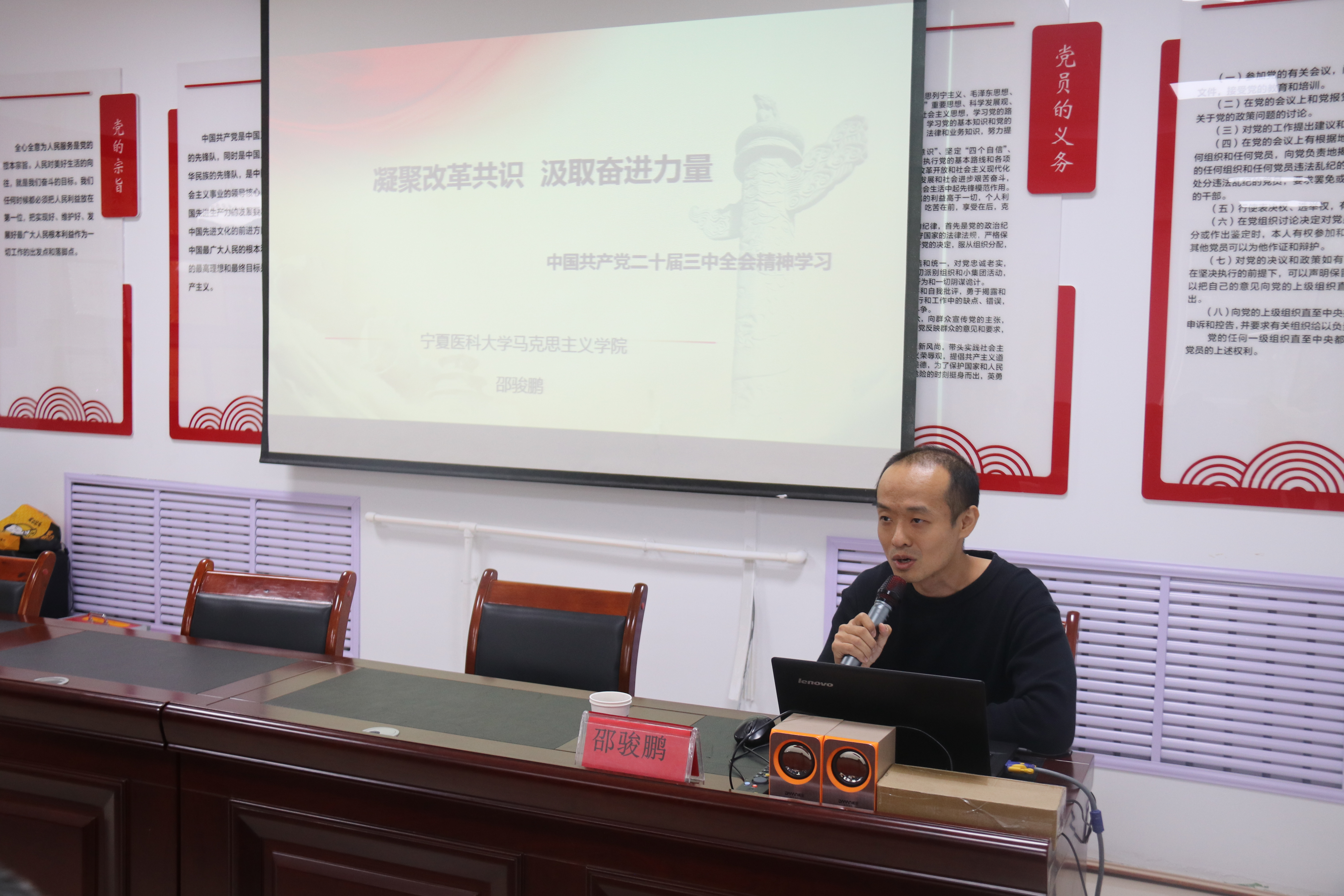 宣讲党的创新理论,传播党的时代声音,让全会精神走进基层,走进党员心中。邵骏鹏副教授对党的二十届三中全会精神进行了系统阐述和深入解读,结合习近平总书记考察宁夏重要讲话精神,重点讲述了全会的重大意义、丰富内涵和精神实质,以鲜活的语言、生动的案例阐释了全会与群众生活息息相关的健全保障和改善民生制度体系方面的内容,将党的创新理论和改革部署举措传递到基层。使党员同志更加准确地理解党的二十届三中全会精神的深层含义,更加深刻的领会和把握进一步全面深化改革的主题、重大原则、重大举措、根本保证,学在其中,思在其中。
