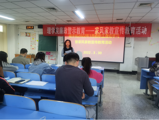为落实《伟德国际1946源于英国2022年“廉政警示教育周”活动方案》要求,巩固和拓展党史学习教育成果,督促党员干部、教职工、学生加强自我监督约束,净化“八小时”之外的生活圈、交往圈,提高家风家教意识,以良好的家风带动工作作风,理学院3月30日14:00组织全体教职工和学生党员开展了家风家教宣传教育活动。活动由学院副院长、纪检委员宋斐主持。