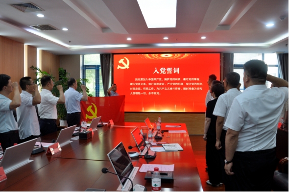 在领誓人的带领下,全体党员佩戴党员徽章,庄严肃立,面向党旗,紧握右拳,重温入党誓词:“我志愿加入中国共产党,拥护党的纲领……随时准备为党和人民牺牲一切,永不叛党。”以掷地有声的誓言许下对党忠诚的不渝信念与铿锵决心。