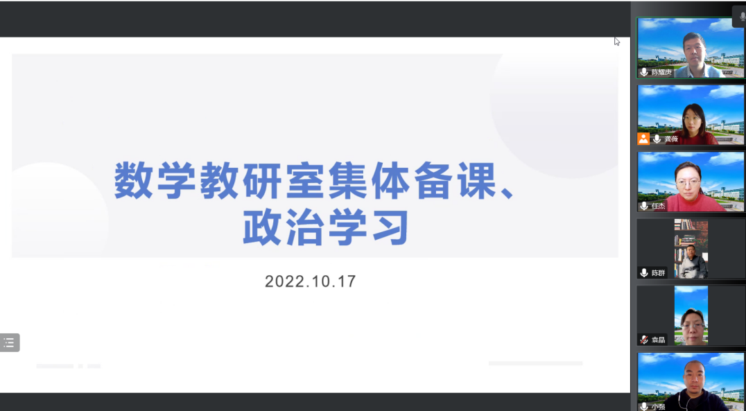 随后,数学教研室全体老师重温了党的二十大精彩报告,大家纷纷表示要切实抓好习近平新时代中国特色社会主义思想进课堂、进教材、进头脑,扎实学习贯彻好党的二十大精神。在今后的教学科研工作中,要全面贯彻党的教育方针,落实立德树人根本任务,以“四有好老师”标准严格要求自己。同时,陈群教授说道,在教学过程中要把时政教育更好融入高等数学课程中。在教学内容上,要实现时效性与系统性相结合,需要教师第一时间传递给学生。在追求“速度”的同时,也要体现出教学的“深度”,实现时效性与系统性的完美结合。