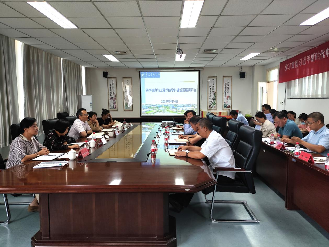 调研会上,医学信息与工程学院院长孙玉宁汇报了学院学科发展建设工作情况。学校教务处处长杨怡、公共卫生学院党委书记杨慧芳、人文与管理学院院长乔慧及学院领导班子、教师代表围绕学院学科建设,就教师队伍建设、教学质量提升、本科生培养、智能医学工程新专业建设等方面进行交流座谈,就学科建设发展路径提出意见和建议。