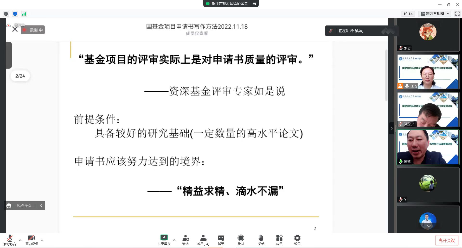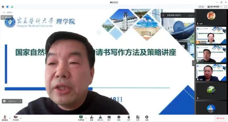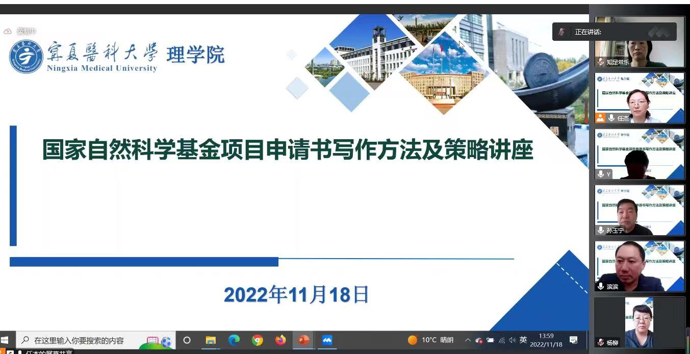 11月18日下午,理学院2023年国家自然科学基金项目申报培训讲座以腾讯会议形式举办,邀请宁夏大学葛永斌教授作了题为“国家自然科学基金项目申请书写作方法及策略”的专题报告,孙玉宁院长主持,全体教师参加。