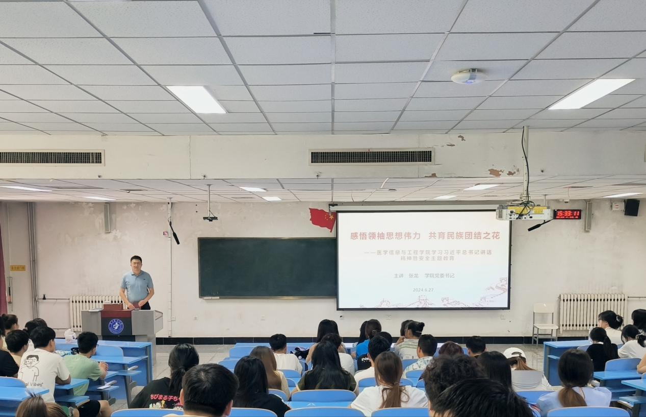 为深入学习宣传贯彻习近平总书记重要讲话精神,加强学生校园安全工作,6月27日下午,学院在厚生楼101教室开展了“感悟领袖思想伟力 共育民族团结之花”——学习宣传贯彻习近平总书记重要讲话精神暨校园安全教育。学院党委书记张龙、学办主任及全体在校学生参加。