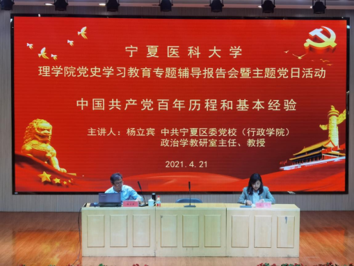 4月21日,理学院党总支开展党史学习教育专题辅导报告会暨主题党日活动,特邀中共宁夏区委党校(行政学院)政治学教研室主任杨立宾教授作专题学习辅导报告。学校党委常委、副校长、党史学习教育第四巡回指导组组长郝银菊同志出席了报告会,学院党总支书记白启钧主持了报告会。