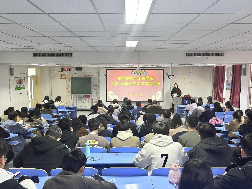 为了让学生更好的反思和总结实习过程,增强职业意识和提高综合素质,12月7日下午,医学信息与工程学院在厚生楼201教室组织开展2024届毕业生实习中期汇报,学院党委书记白启钧、副院长宋斐、各教研室老师、2020级、2021级电子信息班全体同学参加了本次活动。