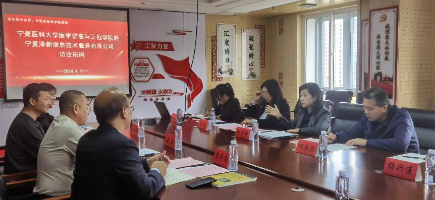 为进一步深化校企合作,加强人才培养与产业需求的对接,学院于4月9日上午赴宁夏泽新信息技术服务有限公司开展了访企拓岗活动。活动由学院党委书记白启钧主持,宁夏泽新信息技术服务有限公司总经理董涛、副总经理李永忠、杨文涛,技术总监李曦斌,以及学院党委副书记代良兵、副院长宋斐、学办主任、教学办等共同参加。