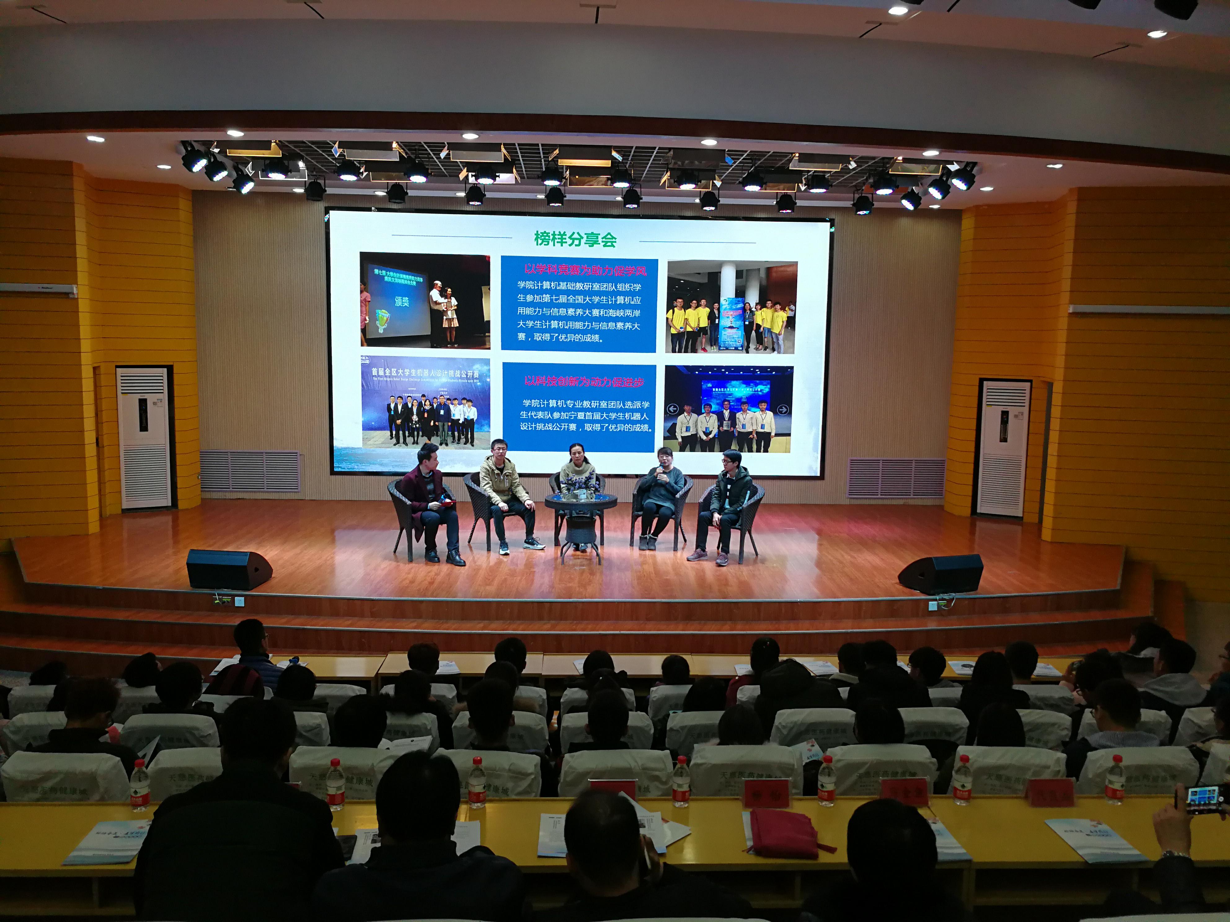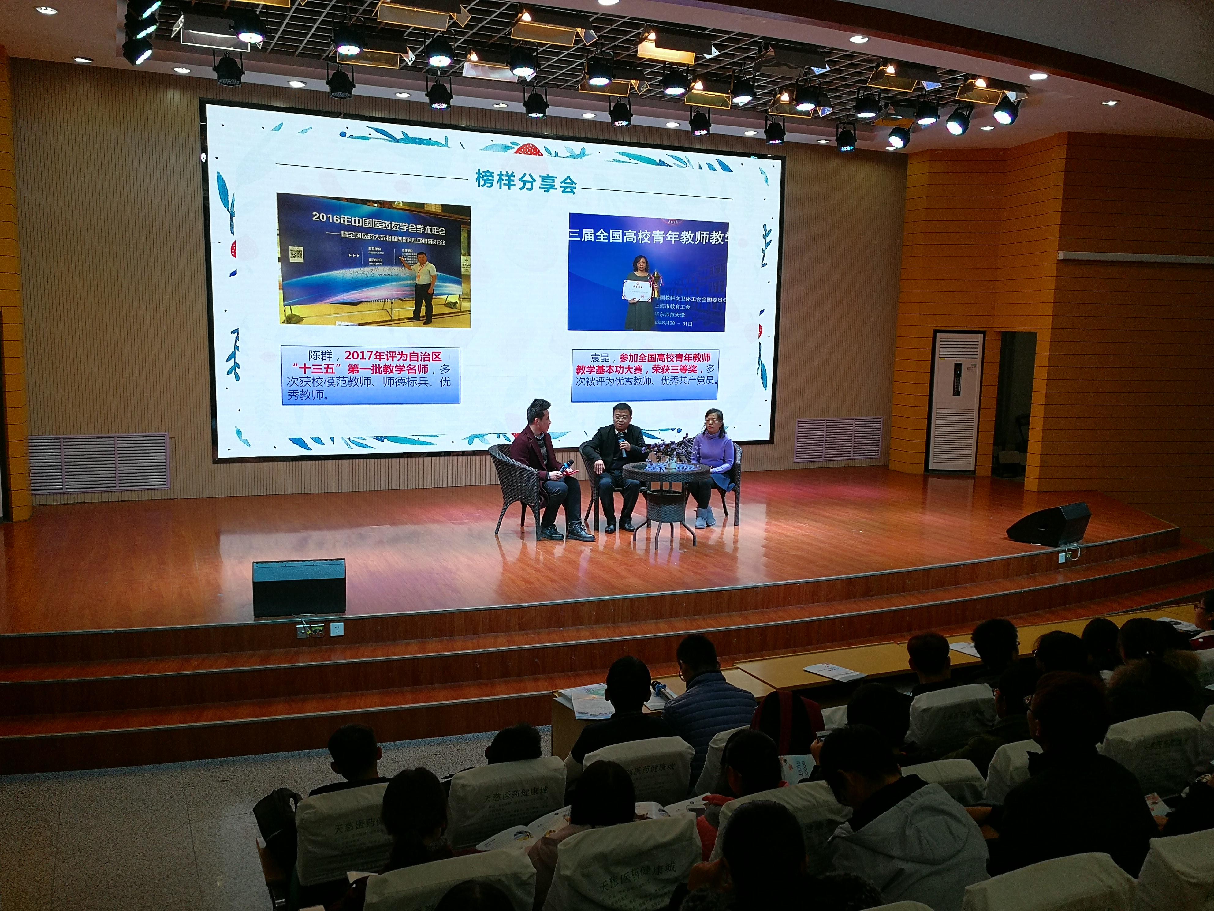 理学院往届毕业生寄语以及学院在校优秀学生事迹的视频拉开了榜样分享会的序幕,首先分享的四位同学是17届研究生支教团的赵一凡、今年6月考到北方民族大学软件工程专业硕士研究生的王辛以及2014级电子信息班的伍帆和陈琛,他们从支教、如何考研、出国留学做的准备、如何学好专业等方面分享了他们宝贵的经验。其次分享的是代表学校参加第七届全国大学生计算机应用能力与信息素养大赛和全区首届机器人挑战公开赛的两个师生团队,无论是指导老师还是学生代表,分享了的他们参加竞赛的经验和收获,也为台下学生参加各类竞赛指明了方向。最后分享的是学院陈群和袁晶老师,陈群老师2017年被评为自治区“十三五”第一批教学名师,袁晶老师代表学校参加全国高校青年教师教学基本功大赛荣获三等奖,两位老师分享了他们教学、授课方面的经验,同时也为低年级学生如何学好高数课给出了一些学习方法。最后,主持人与台下的学生进行互动,2017级新生董静静表示:“今天的榜样分享会收获非常大,学长学姐为大家树立了学习的榜样,今后我也要努力成为一名优秀的学生。”