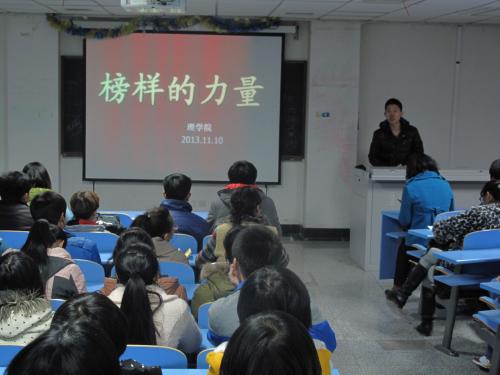 为了加强学风建设,充分发挥榜样的典范作用,教育引导我院广大学生进一步坚定理想信念,努力学习,发奋成才。2013年11月10日晚,我院在厚生楼201教室为全体同学举办了“榜样的力量”主题报告会。本次报告会邀请到已经毕业参加工作的2008级优秀学长王勇和国家奖学金获得者2010级张明达同学做报告。